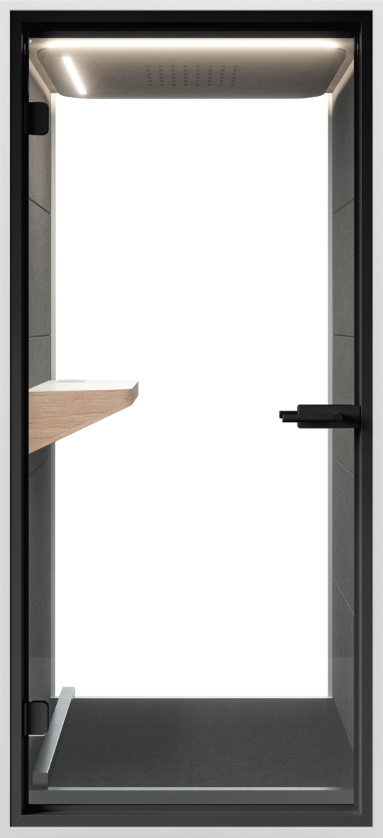 FokusBox1 ist eine kompakte Telefonbox für eine Person und mit einem Stehtisch ausgestattet. Konstruktion aus Aluminiumrahmen in Schwarz (RAL9005) sowie Korpus aus melaminbeschichteter MDF-Platte in Stärke 25 mm. Die Plattenelemente sind mit ABS Kante in Stärke 2mm ausgeführt. Innenverkleidung mit 12mm PET Akustikfilz (2800 g/m2). Glaspaneele in Stärke 10 mm, bestehend aus 5+5 mm VSG Glas. Anbringung der Glaspaneele durch Aluminiumprofile. Tisch aus Birkenschichtholz. Oberfläche aus HPL in Stärke 1 mm. Elektrik angebracht im Deckenmodul (von oben zugänglich für Service). 12V Elektriksystem für Beleuchtung und Belüftung. 230V Elektriksystem für die Steckdose. Durch das Kontrollpanel (2x Dimmer) kann der Nutzer die Intensität von Beleuchtung und Belüftung regulieren.