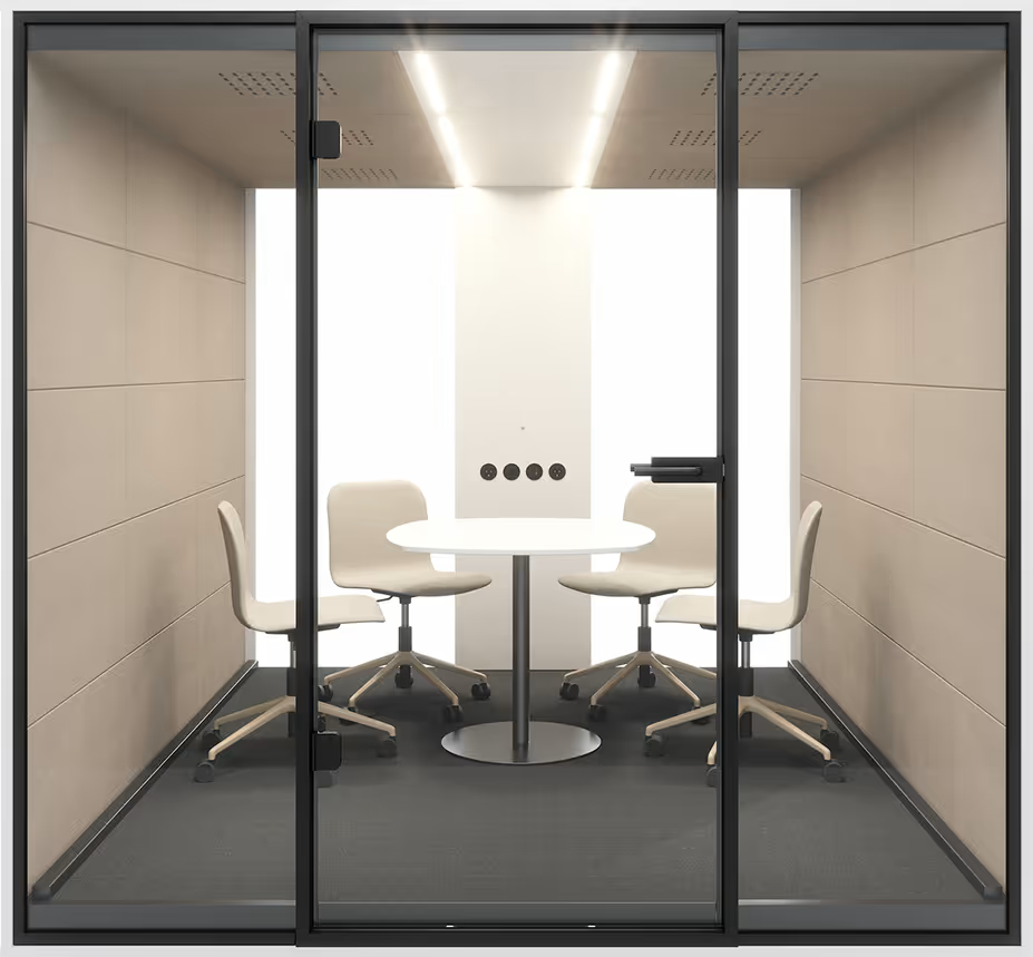 FokusBoxXL ist eine modulare Besprechungskabine, die in der Tiefe um 90 cm-Segmente erweitert werden kann. Das Basismodul (180cm tief) besteht aus dem Vorder- und dem Rückmodul. Zusätzliche Segmente können in der Mitte hinzugefügt werden. Konstruktion aus Aluminiumrahmen in Schwarz (RAL9005) sowie Korpus aus melaminbeschichteter Spanplatte in Stärke 25 mm. Die Plattenelemente sind mit ABS Kante in Stärke 2mm ausgeführt. Innenverkleidung mit 12mm PET Akustikfilz (2800 g/m2). Glaspaneele in Stärke 10 mm, bestehend aus 5+5 mm VSG Glas. Anbringung der Glaspaneele durch Aluminiumprofile. Elektrik angebracht in der Mittelkonsole (Verkleidung demontierbar von Innen für Service). 12V Elektriksystem für direkte Beleuchtung und Belüftung. 230V Elektriksystem für indirekte Beleuchtung und Steckdosenleiste. Durch das Kontrollpanel (2x Dimmer) kann der Nutzer die Intensität von Beleuchtung und Belüftung regulieren.