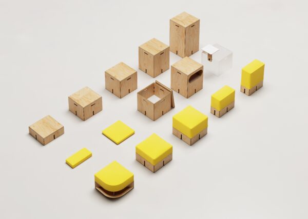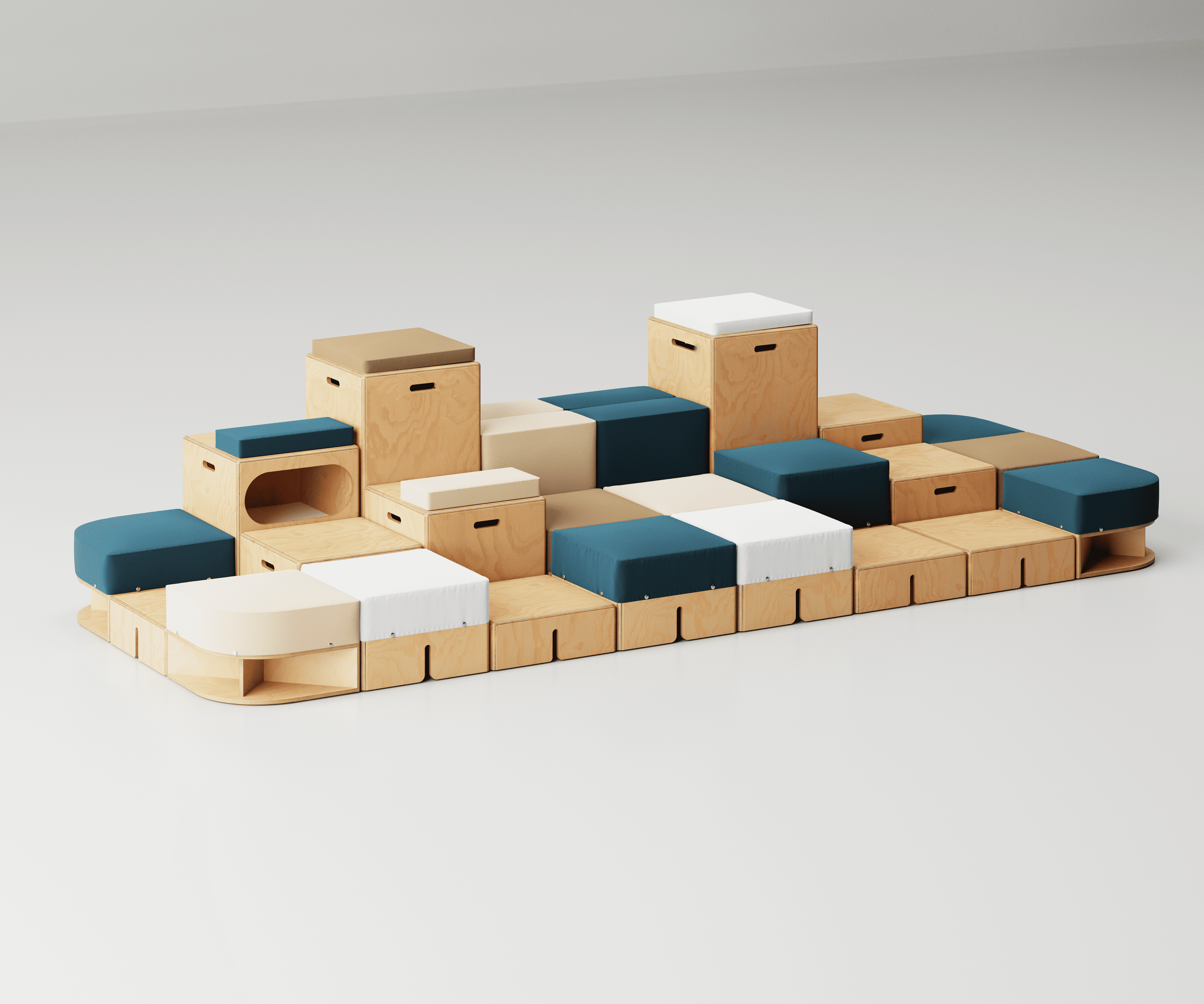 • Holzmodule: In fünf verschiedenen Höhen erhältlich, mit zwei praktischen Aufbewahrungslösungen für Laptops, Notizbücher oder Kissen.