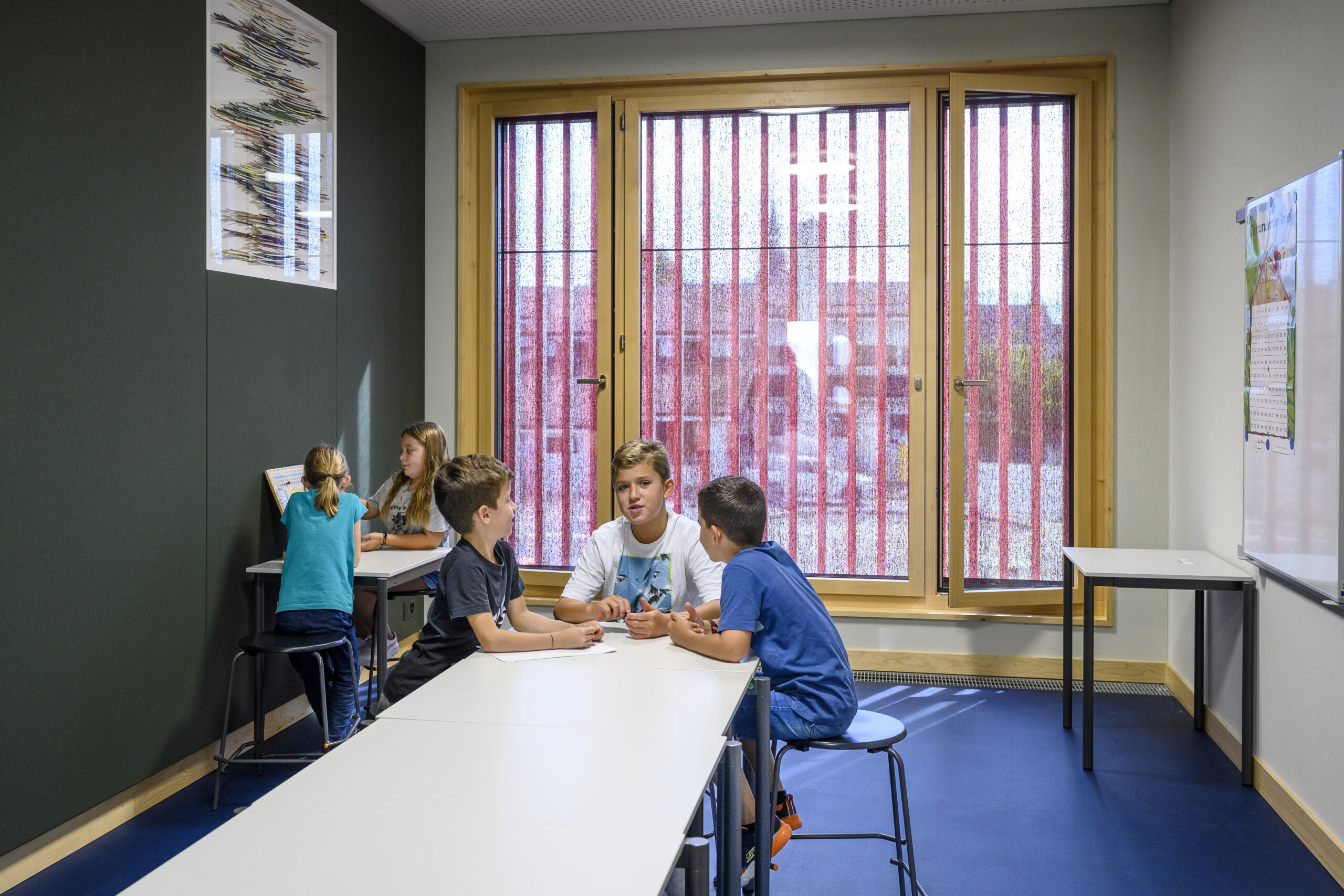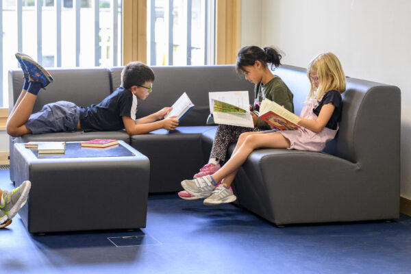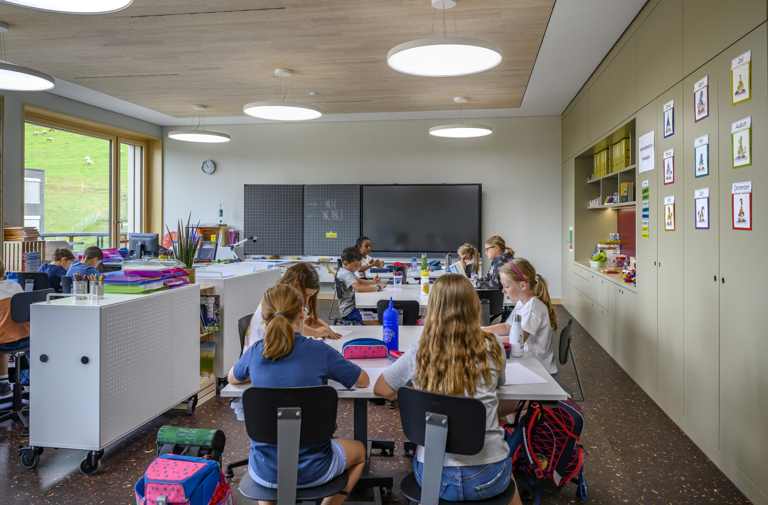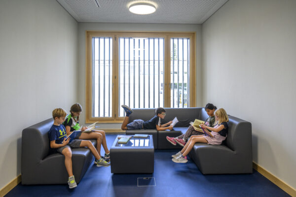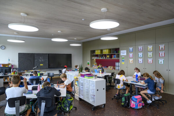 Komplette Möblierung der Klassenzimmer, Foyer, Gruppenräume und Lehrerzimmer mit der Knobel-Linie. Sowie die komplette visuelle Einrichtung mit 7er-Buchwandtafeln mit Schiebekasten und 86 Zoll Touchscreens. Die Rückwände und Gruppenräume wurden mit dem flexiblen reko-line Wandschienensystem ausgestattet.